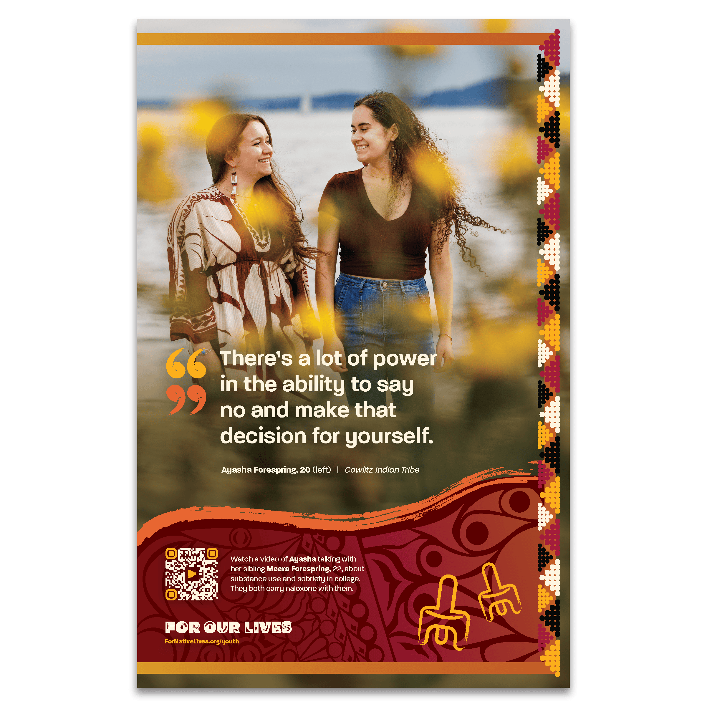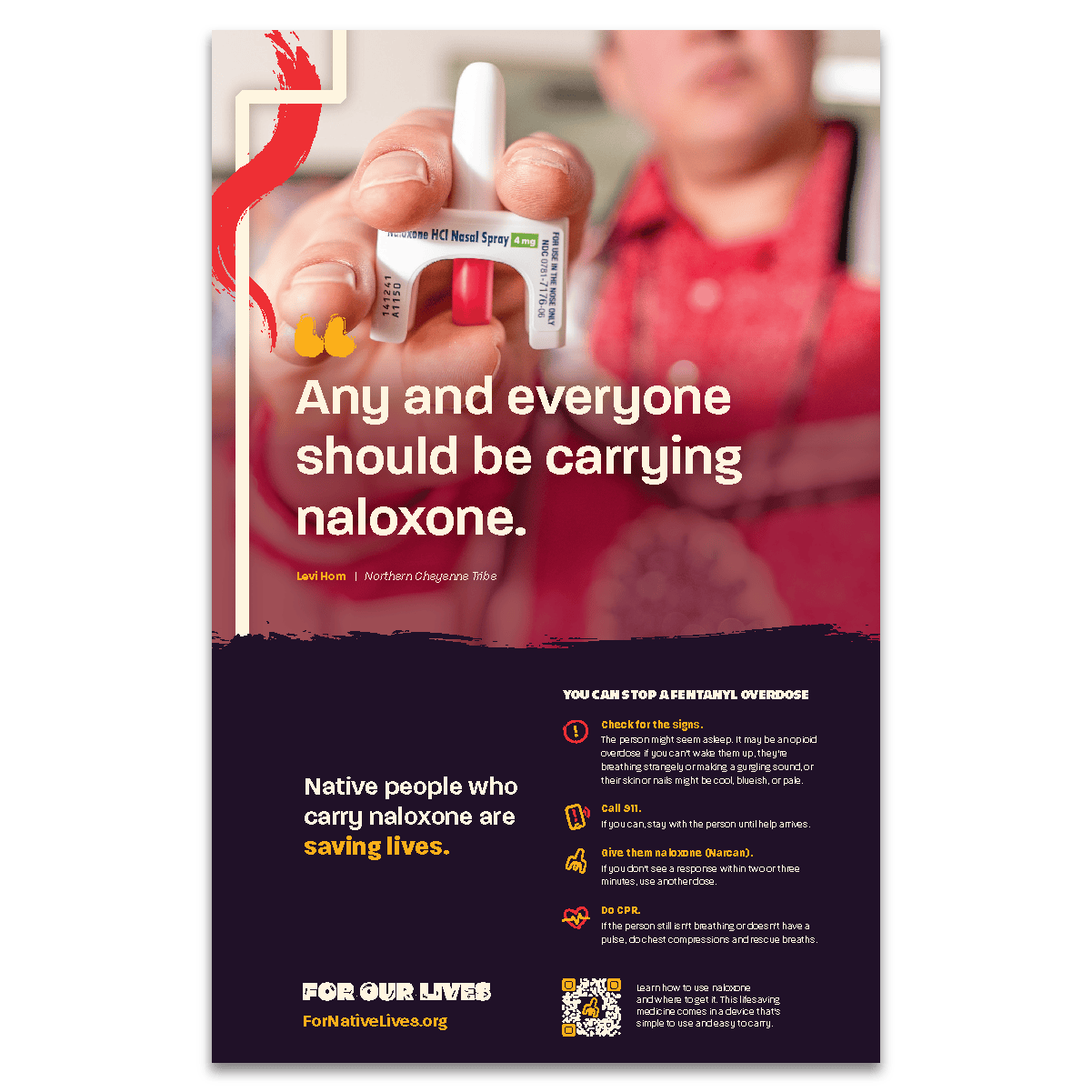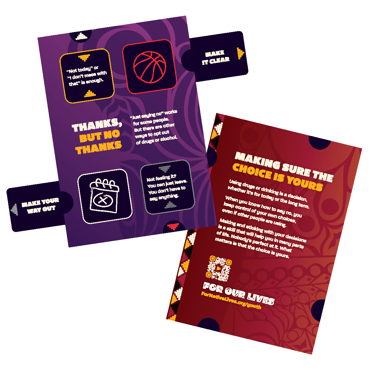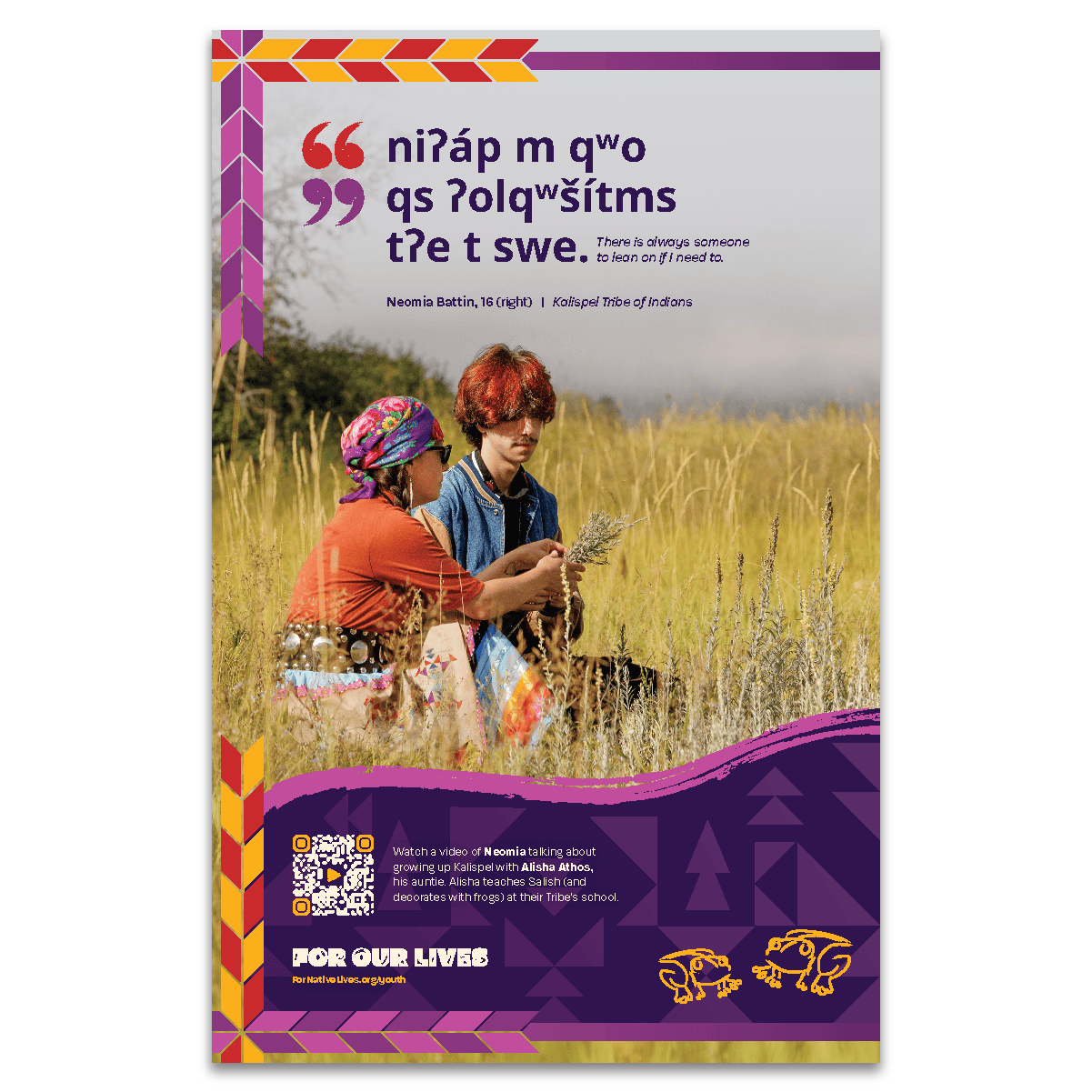 The For Our Lives campaign toolkit includes print materials, videos, social media posts, digital graphics, and other materials. It’s all available at no cost to tribes or organizations serving Native people in Washington state. Please download the materials below, or contact our team to place a custom order. We can: