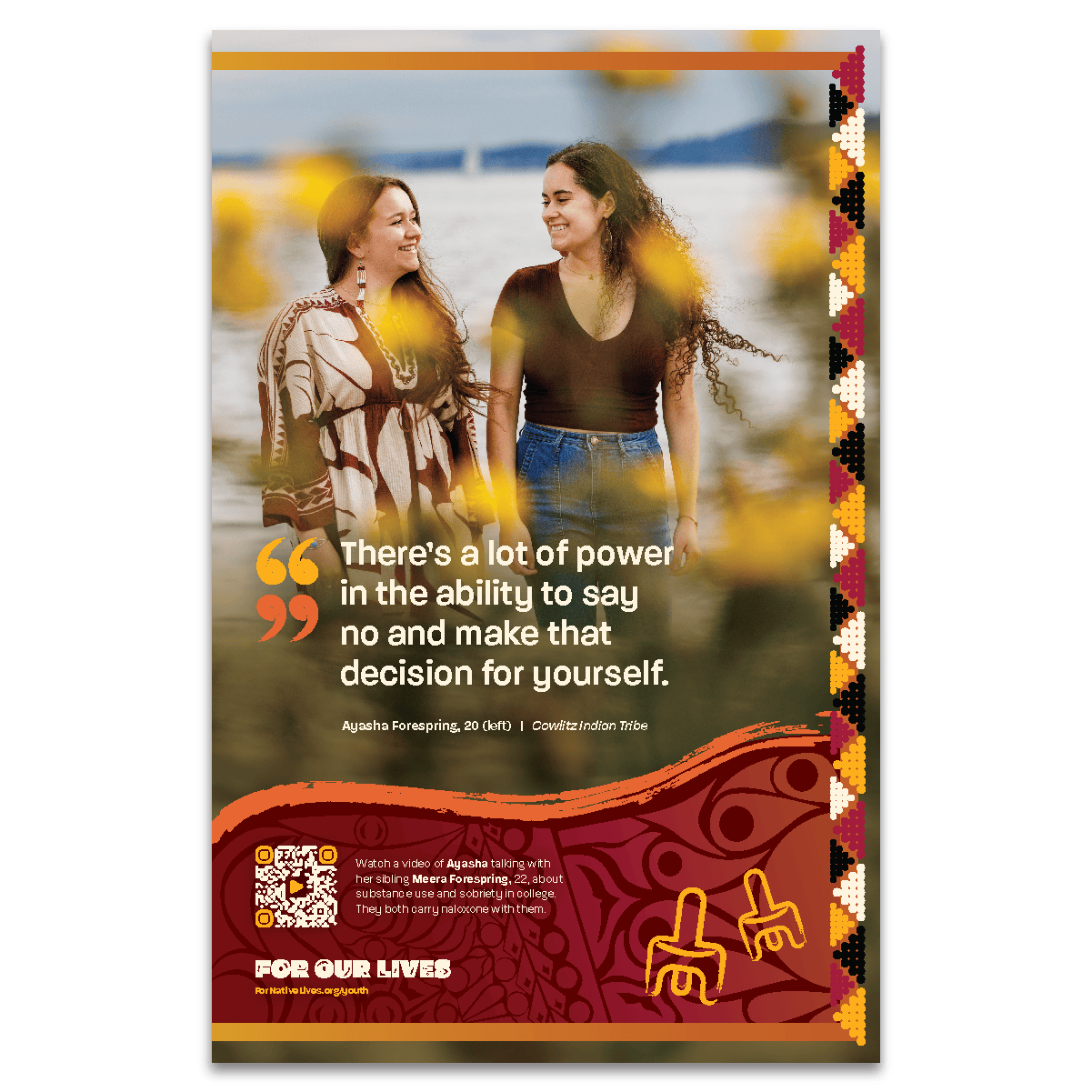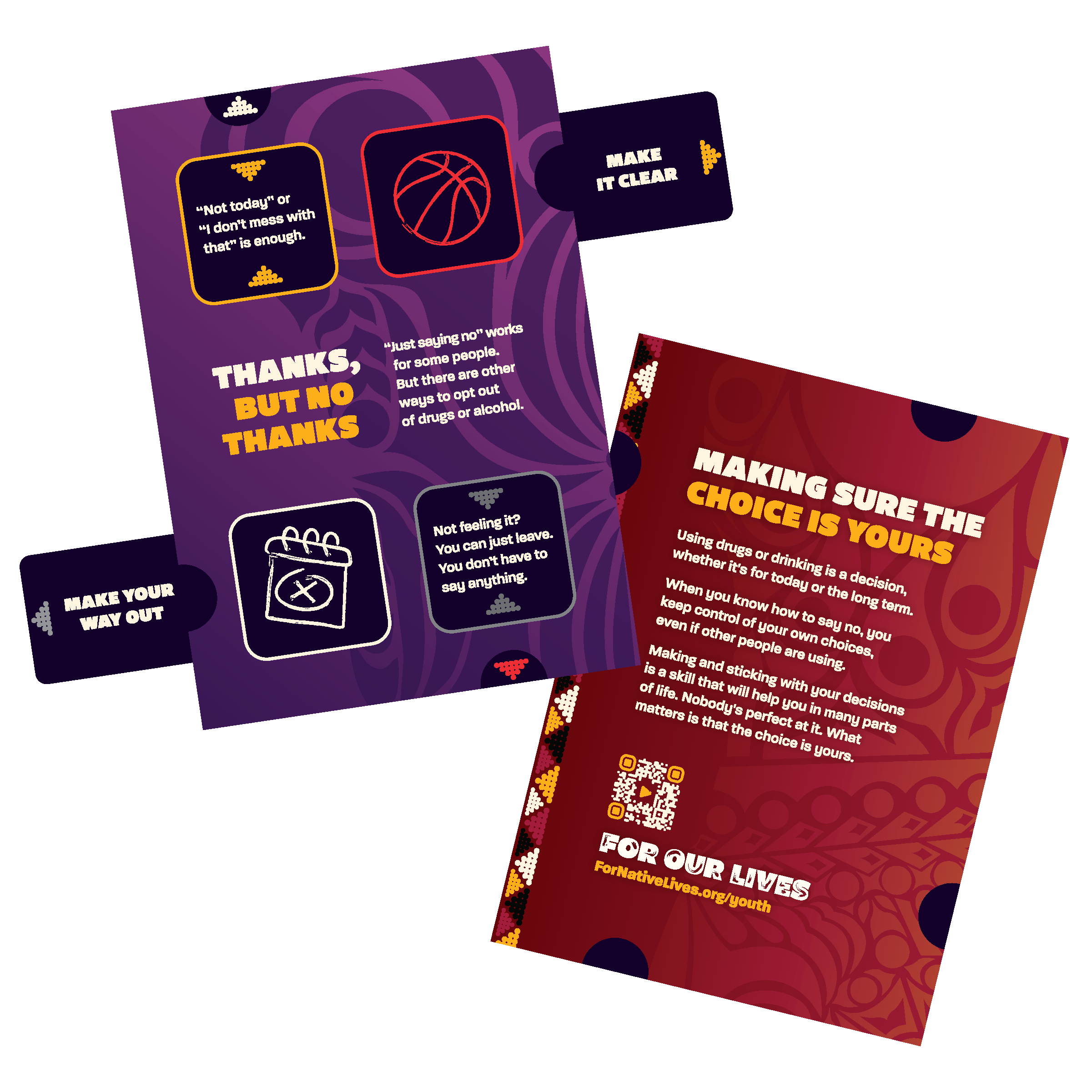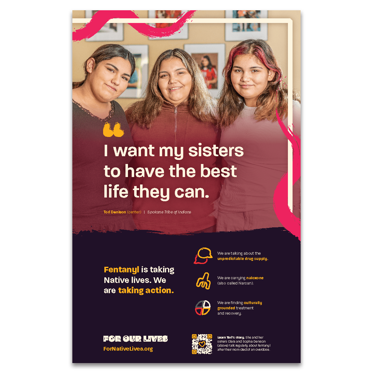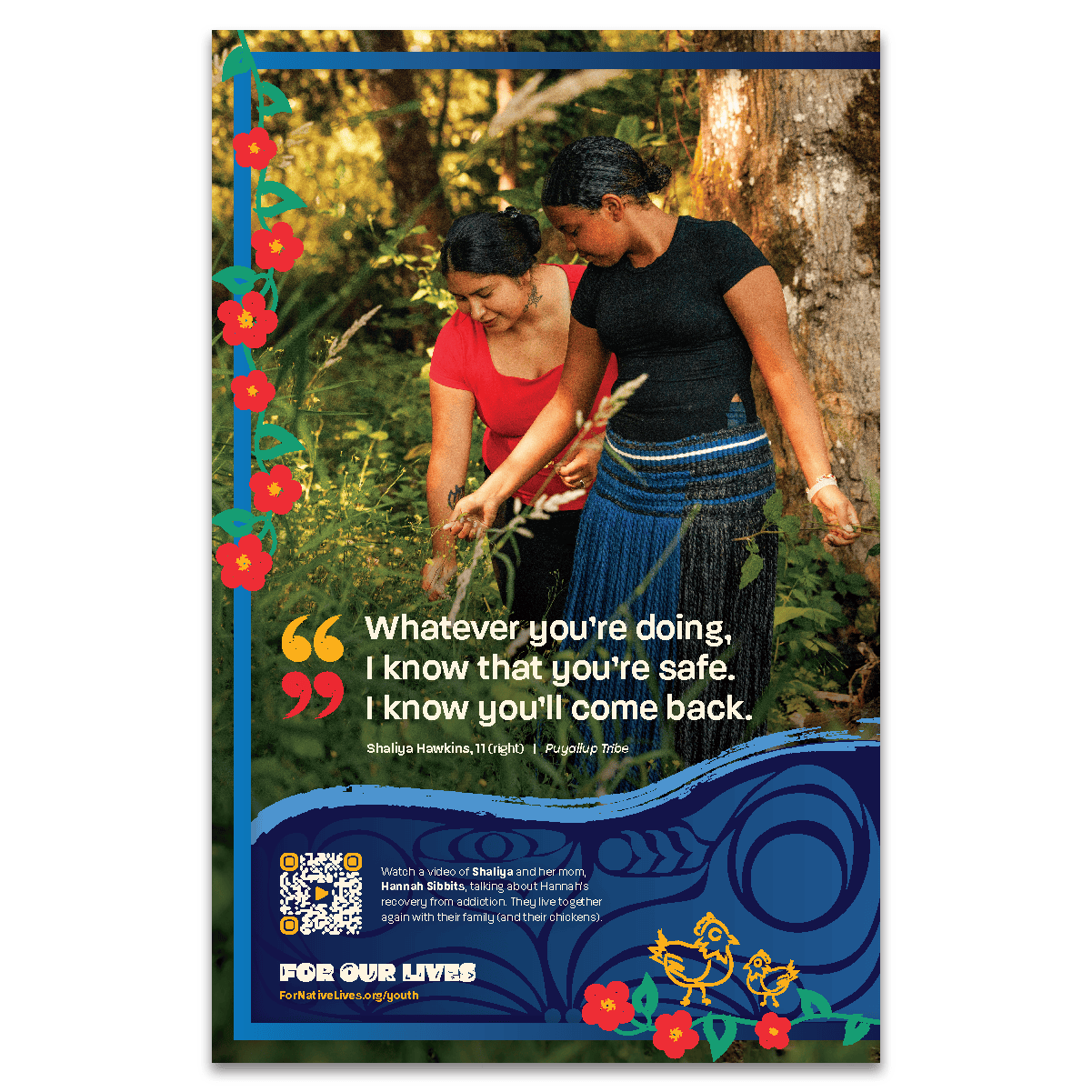 The For Our Lives campaign toolkit includes print materials, videos, social media posts, digital graphics, and other materials. It’s all available at no cost to tribes or organizations serving Native people in Washington state. Please download the materials below, or contact our team to place a custom order. We can: